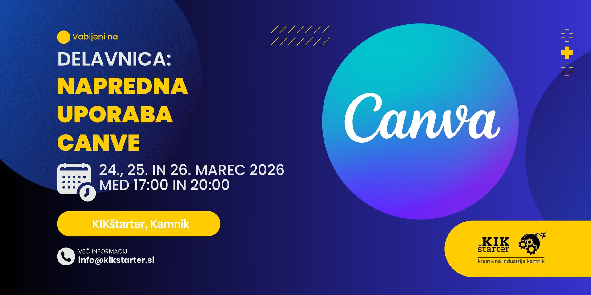 Nika Škrjanec, vodja podjetniškega inkubatorja KIKštarter, bo z vami delila svoje bogate izkušnje in praktične nasvete za napredno uporabo Canve.