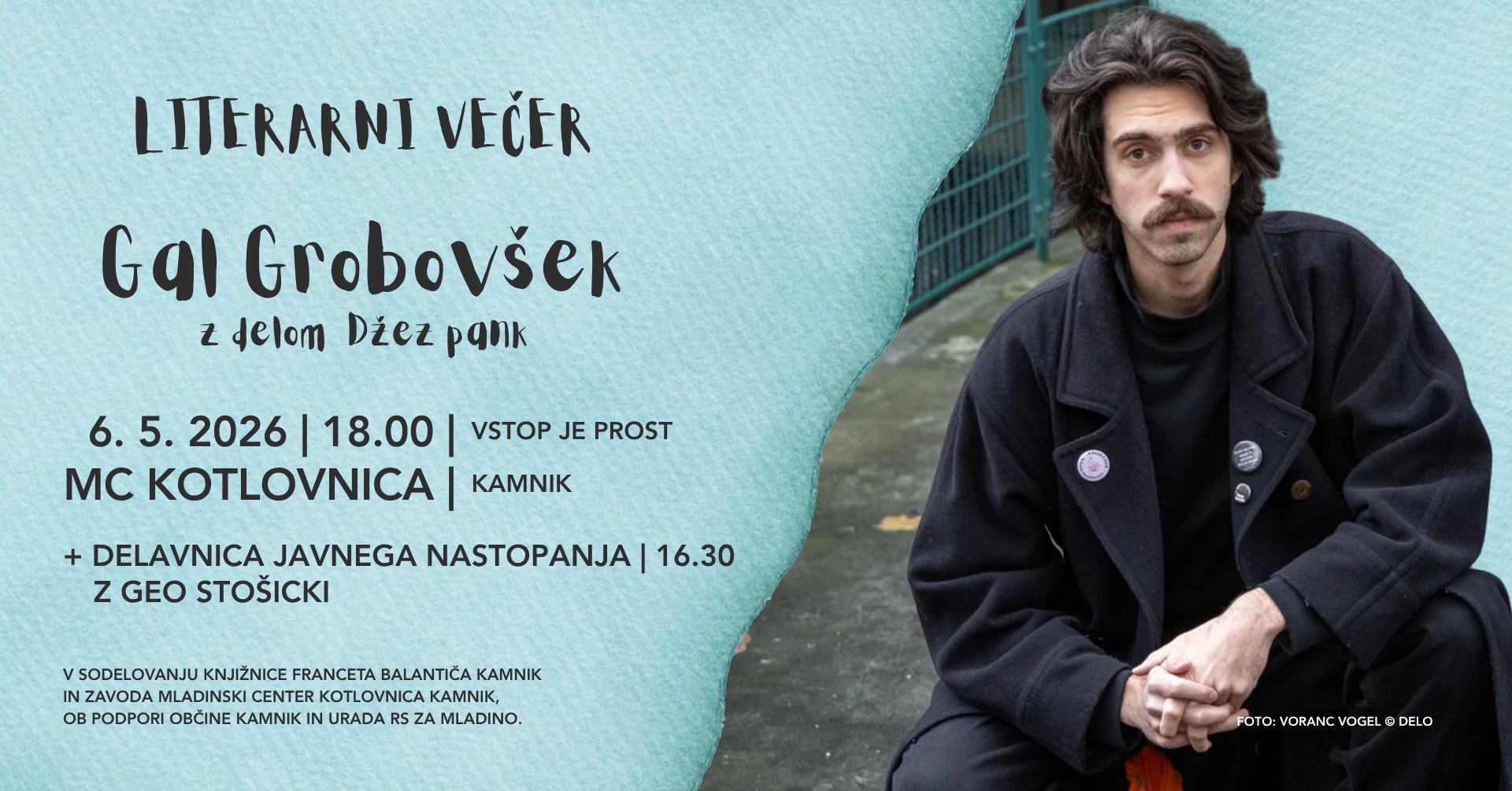 Majski literarni večer se začne ob 18-ih, pred njim pa bo v Kotlovnici potekala tudi brezplačna delavnica javnega nastopanja z Geo Stošicki med 16.30 in 17.30, ki je odprta za vse. Dogodek se bo ob 18-ih začel s kratkim odprtim mikrofonom: poleg udeleženk in udeležencev krožka lahko na delavnici in na uvodnem branju sodelujete tudi tisti, ki ne obiskujete krožka!
