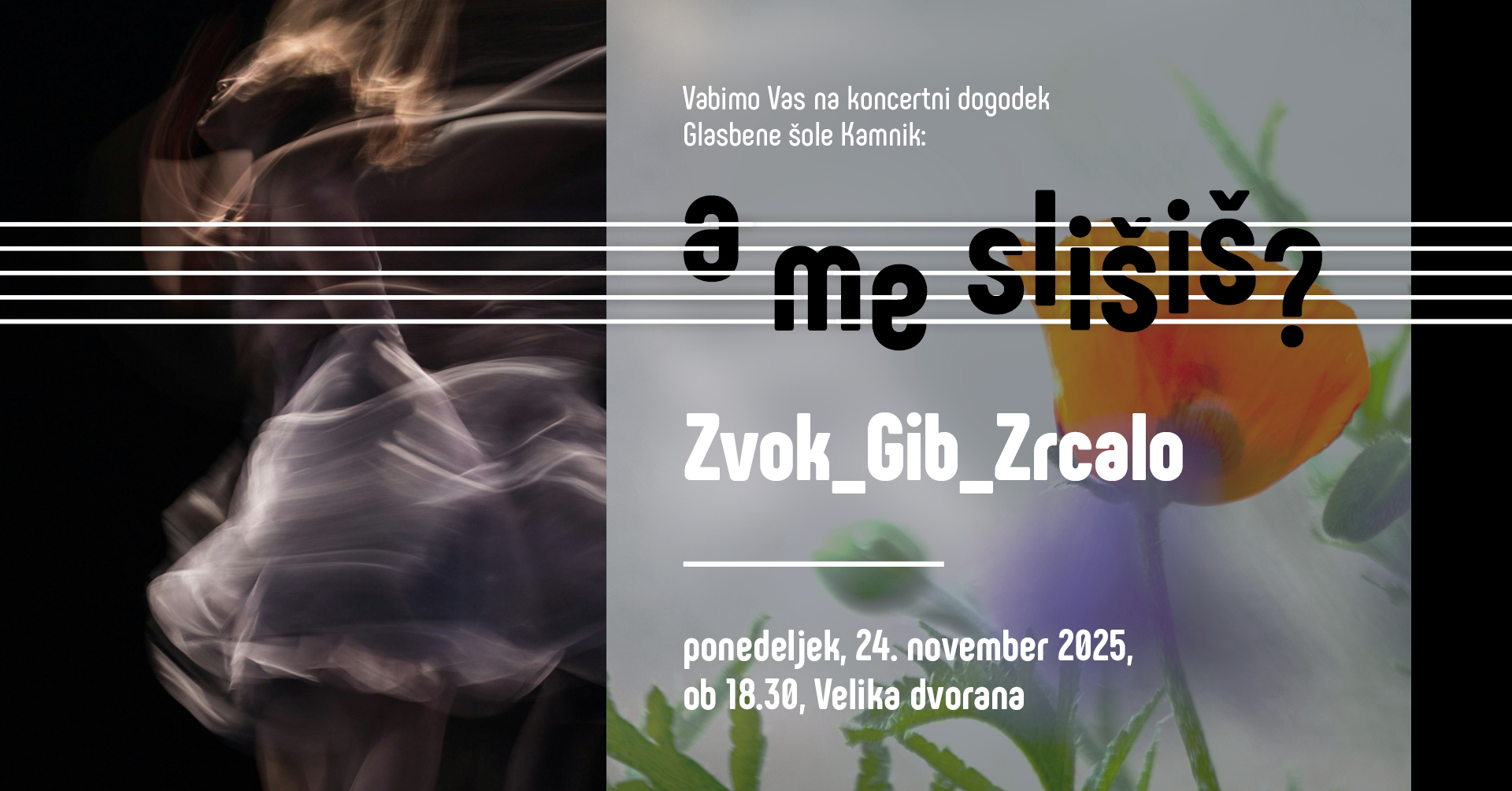 Zavod za kulturo Kamnik, Fužine 10, Kamnik Domov ProgramProgramski arhiv A me slišiš?: Zvok_Gib_Zrcalo 24. 11. 2025, 18.30 2025-11-05T15:22:00+01:00 glasbeni abonma Glasbene šole Kamnik Na prvem večeru cikla glasbenega abonmaja Glasbene šole Kamnik bodo nastopili učenci baletnega oddelka in učenci čela. Vstop prost.