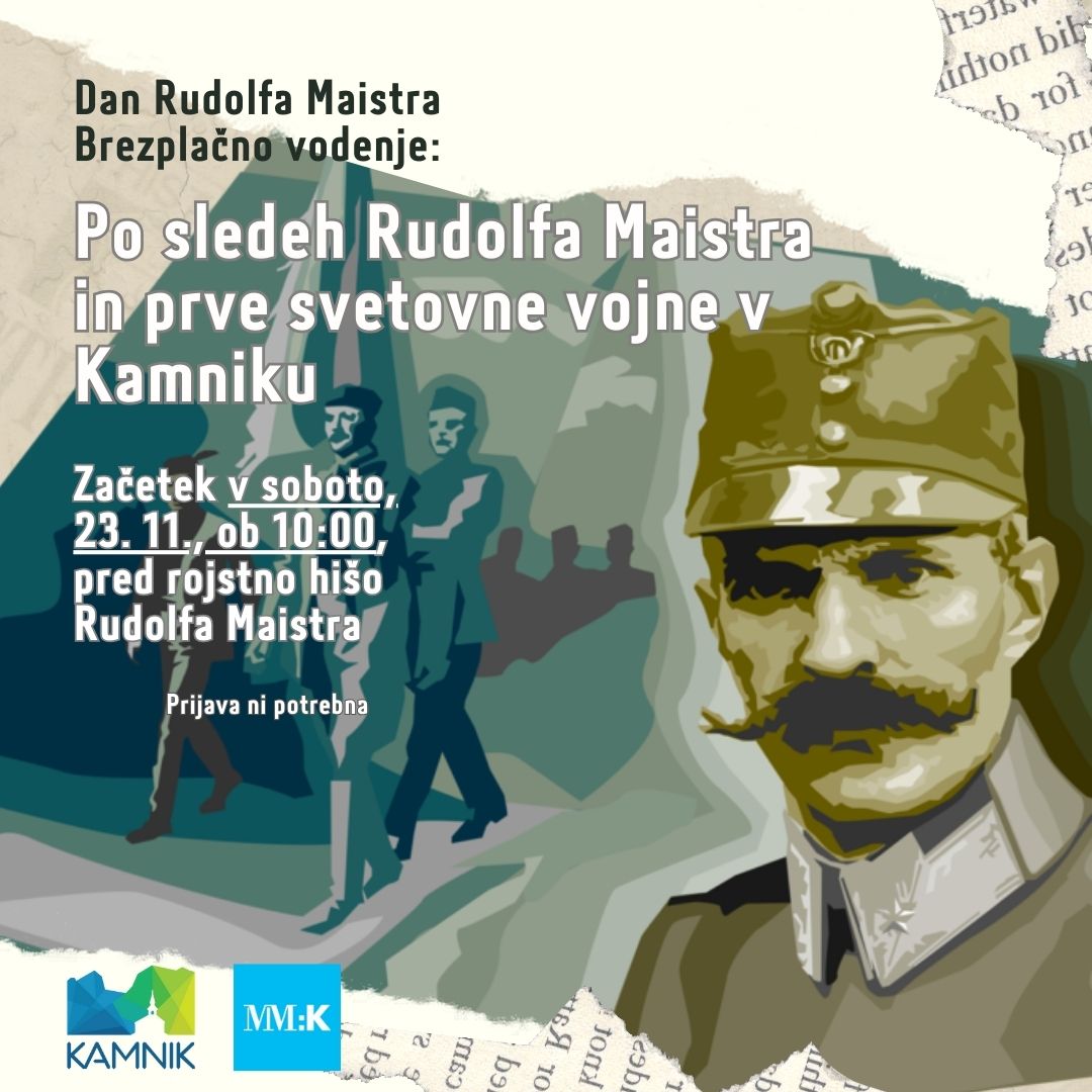 Javno vodstvo se začne v Rojstni hiši Rudolfa Maistra, kjer si boste ogledali razstavo Maister in rodni Kamnik, nadaljevali do spomenika Rudolfa Maistra in kamniških Žal ter zaključili v zasebni vojaški zbirki Mira Potočnika.