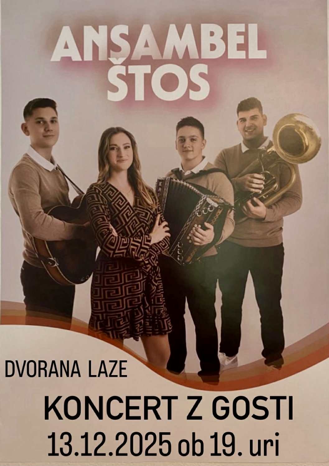 Kulturno društvo Tuhinj kulturnodrustvotuhinj@gmail.com Laze v Tuhinju 4.A, 1219 Laze v Tuhinju Domov Koledar prireditev Koncert ANSAMBEL ŠTOS z glasbenimi gosti 13. 12. 2025, 19.00 – 21.30 2025-12-07T11:18:32+01:00