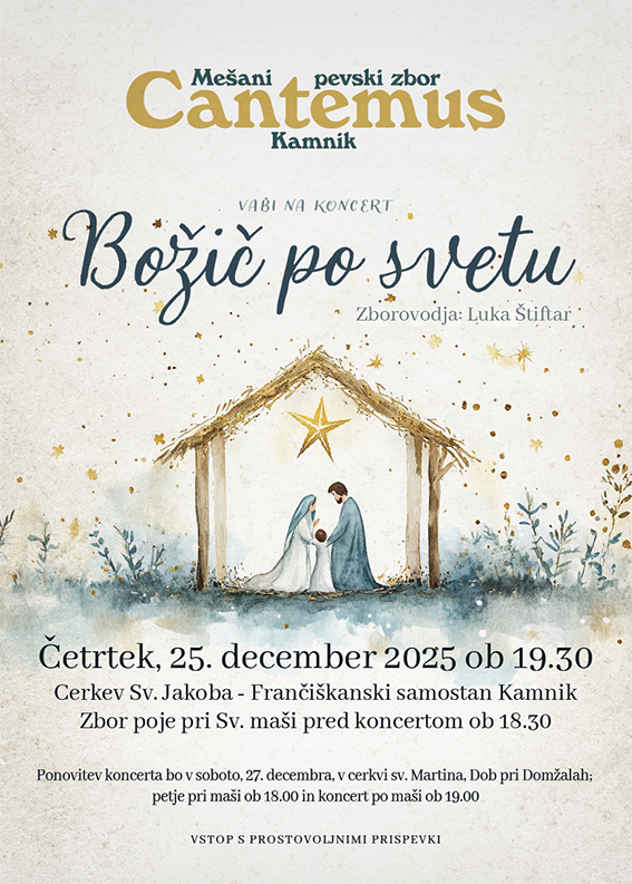 MePZ Cantemus 041754909 roman.cantemus@gmail.com Kajuhova pot 11, 1241 kamnik Domov Koledar prireditev MePZ CANTEMUS - BOŽIČ PO SVETU (Božični koncert) 25. 12. 2025, 19.30 2025-12-04T11:00:28+01:00 Zborovodja Luka ŠTIFTAR Zbor bo sodeloval pri Sv. maši ob 18.30.