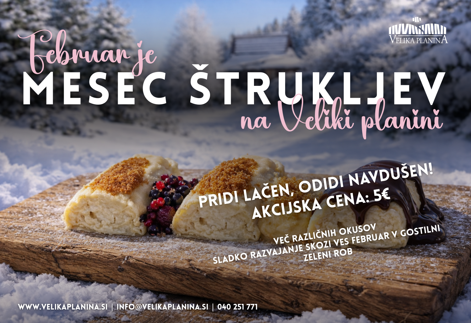 Akcijska cena štrukljev v sklopu "MESEC ŠTRUKLJEV NA VEL'KI" velja samo v februarju – rezervirajte si čas in se prepustite sladkim dobrotam v gostilni Zeleni rob.