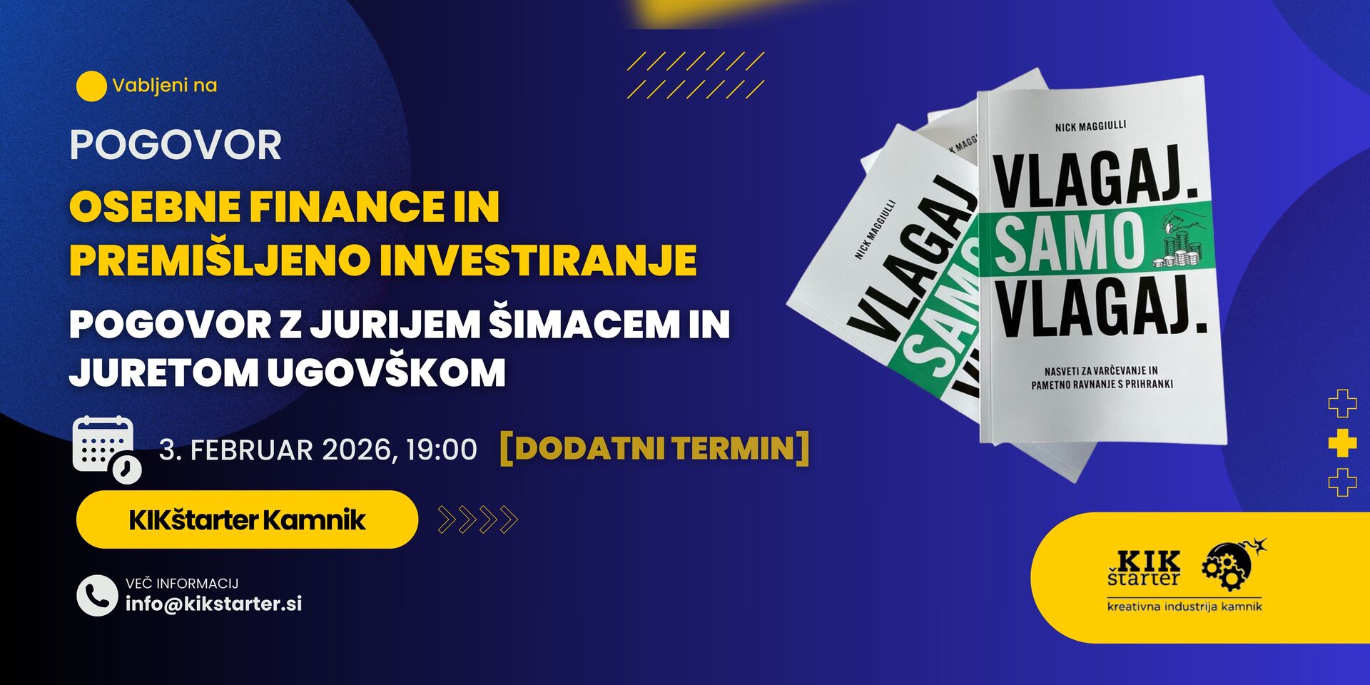 Vabimo vas na pogovor z dolgoletnima finančnima novinarjema in urednikoma Jurijem Šimacem (namestnik odgovorne urednice Časnika Finance) in Juretom Ugovškom (odgovorni urednik revije in portala Moje finance), ki sta v slovenščino prevedla svežo finančno uspešnico »Vlagaj. Samo vlagaj!« avtorja Nicka Maggiullija.