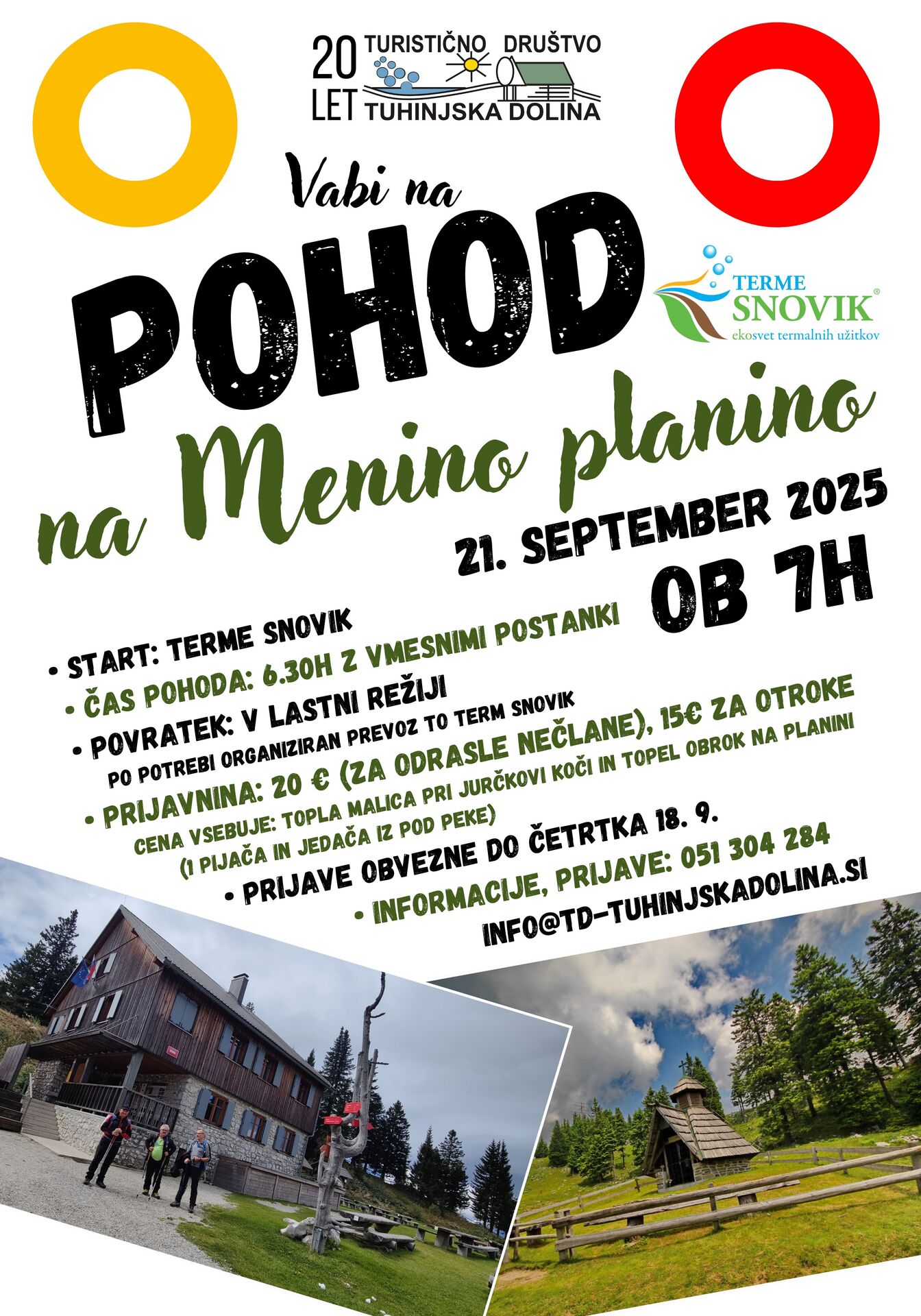 Ko bo poletna vročina samo še bled spomin in bo svežina prihajajoče jeseni obarvala naravo v zlato, se bomo podali na naš tradicionalni pohod od Term Snovik na Menino planino, ob 20-letnici društva.