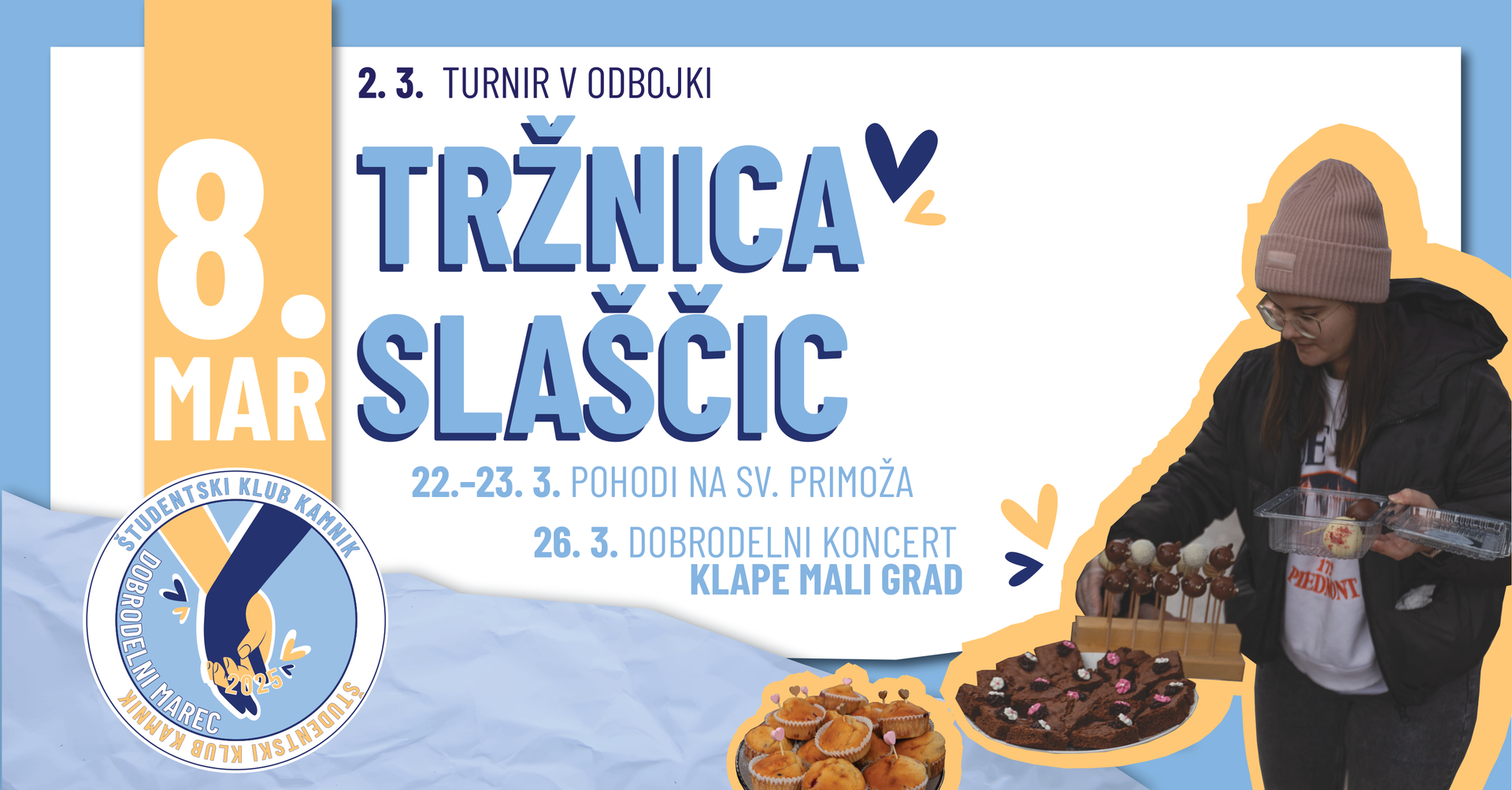 V soboto, 8. marca, dopoldan, bo kamniška tržnica zadišala po domačem pecivu. Člani Študentskega kluba Kamnik bomo sladkosnede obiskovalce pričakali na Tržnici slaščic, kjer bo celoten izkupiček od prodaje šel v dobrodelne namene. Toplo vabljeni!