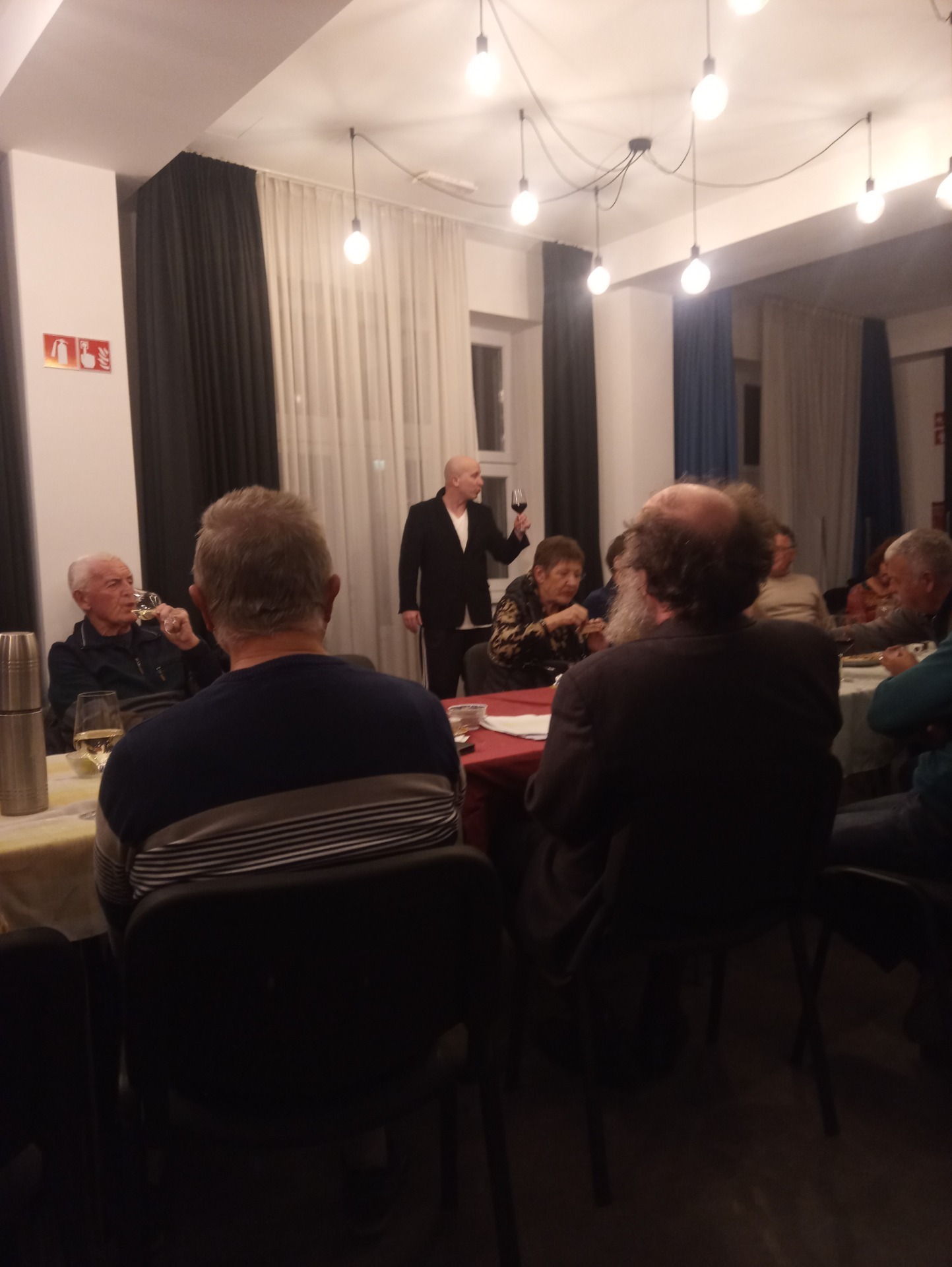 Redko kdaj se zgodi, da se abonenti Maistrovega abonmaja znajdemo na predstavi v Klubu kulturnega doma v Kamniku, še redkeje, če se znajdemo tam za skupno mizo, pogrnjeno z različnimi narezki v družbi znanih kulturnikov. Prav to se je zgodilo 5. in 7. novembra v dveh večernih terminih, ko smo prisostvovali namizni družinski drami z naslovom Kdo je okužil dedka?, ki so jo zasnovali člani Kulturno-umetniškega društva LJUD, znani po uličnih predstavah Invazija in Pocestnica, s katerima so pred leti gostovali v Kamniku. Tokrat so se odločili, da se umaknejo z ulic v zavetje kulturnega hrama in nas s kvalitetnim vinom ter prigrizki omehčajo do te mere, da izpovemo resnične zgodbe, ki so se nam dogajale v času korone. Marsikdo med nami je namreč tekel pred trgovkami in redarji, ker si ni pravočasno nadel maske ali pokazal PCR izvida, recitiral poštevanko ali Podvodnega moža, da bi se mu po 12. letu za hip odprla vrata konzumerizma, trpel družinsko izolacijo, ker je brez ustrezne napovedi in priprav obiskal babico ali dedka, se iz šole in službe odpravil domov še preden se je delovni dan začel, ker je bil test za korono pozitiven in še bi lahko naštevali… Obdobje korone je razkrilo številne frustracije in travme, ki so znotraj družin že tlele pod navidezno mirnim površjem, a jih je epidemija Covida-19 ustrezno prignala na razburkano gladino, kjer so se razbohotile v vsej svoji veličini. Člani KUD-a Ljud so zadnja leta pridno beležili zgodbe prijateljev, znancev, obiskovalcev predstav in mimoidočih, ter jih s pomočjo antropologinje Sanje Žmavc analizirali ter “predelali” v izviren tekst, ki na duhovit način opisuje dostikrat absurdne situacije, ki so pripeljale do tragikomičnih dialogov in iskanja diplomatskih rešitev, pri katerih sta si volk in ovca izmenično podajala svoja oblačila.