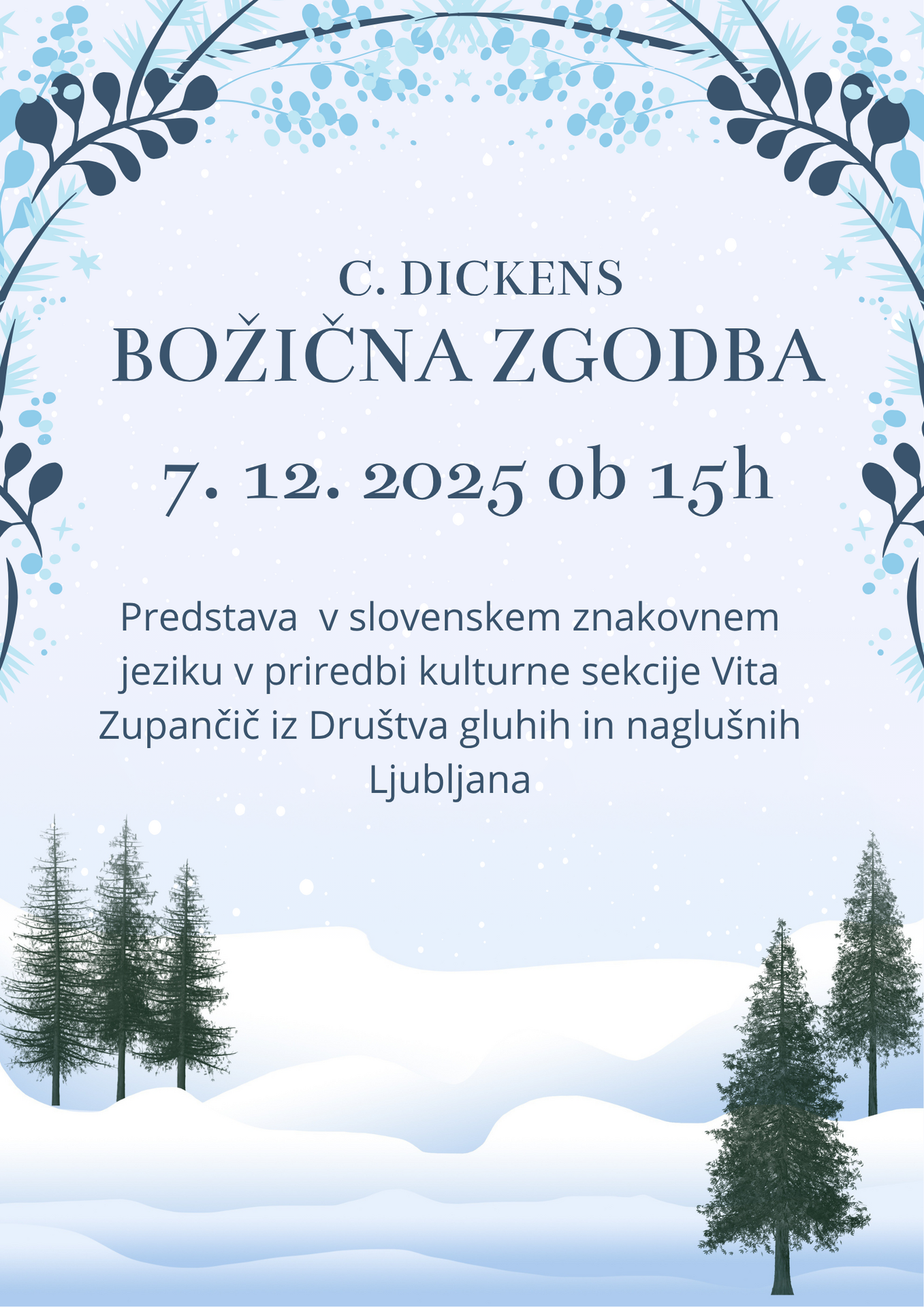 V nedeljo 7. decembra, ob 15.00 vabljeni v Dom Kulture Kamnik, kjer bo prvič v slovenskem znakovnem jeziku predstavljena priredba pravljice Božična pesem. Po predstavi bo otroke obdaroval Dedek Mraz. Za simbolična darila bo poskrbelo Društvo gluhih in naglušnih Ljubljana. Starše zato naprošamo, da ne prinašajo svojih daril.