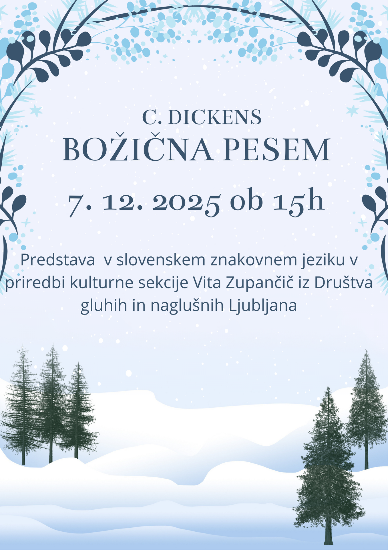 V nedeljo 7. decembra, ob 15.00 vabljeni v Dom Kulture Kamnik, kjer bo prvič v slovenskem znakovnem jeziku predstavljena priredba pravljice Božična pesem. Po predstavi bo otroke obdaroval Dedek Mraz. Za simbolična darila bo poskrbelo Društvo gluhih in naglušnih Ljubljana. Starše zato naprošamo, da ne prinašajo svojih daril.