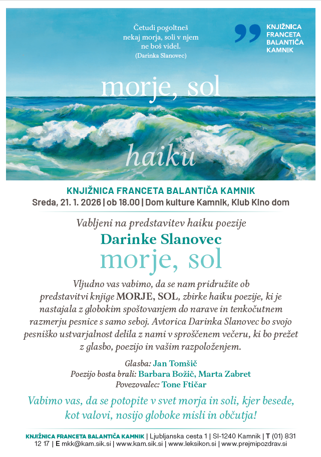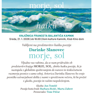 Vljudno vas vabimo, da se nam pridružite ob predstavitvi knjige MORJE, SOL, zbirke haiku poezije, ki je nastajala z globokim spoštovanjem do narave in tenkočutnem razmerju pesnice s samo seboj. Avtorica Darinka Slanovec bo svojo pesniško ustvarjalnost delila z nami v sproščenem večeru, ki bo prežet