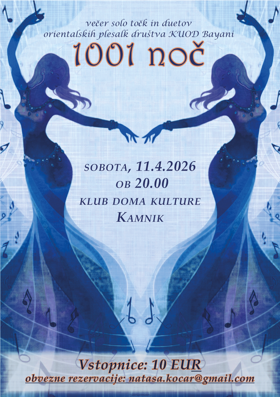 Plesalke društva KUOD Bayani se bodo pokazale v vsej svoji ustvarjalnosti. Večer 1001 noč je namenjen spodbujanju iskanja lastnega izraza v glasbi in gibu. Obeta se čudovit večer.